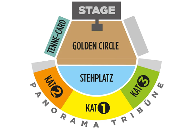 - Golden Circle: Direkt vor der Bühne – exklusiver Bereich mit bester Sicht und einzigartiger Atmosphäre.