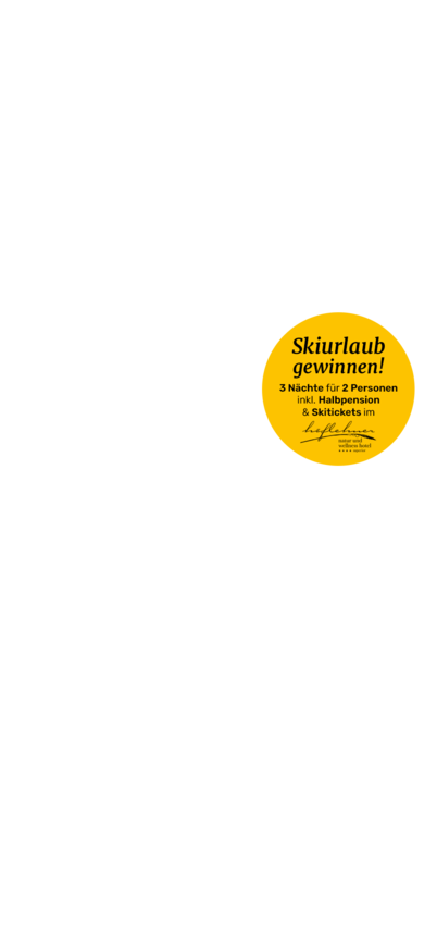 Die Teilnahme ist ausschließlich Personen ab 18 Jahren vorbehalten. Der Gewinn umfasst 3 Nächte für 2 Personen im Natur- und Wellnesshotel Höflehner, inklusive Halbpension sowie Skitickets. Eine Barablöse oder Übertragung des Gewinns ist nicht möglich. Die Einlösung ist nur von Sonntag bis Freitag möglich. Ausgenommen Weihnachten, Silvester und Ferienzeiten. Der Rechtsweg ist ausgeschlossen.