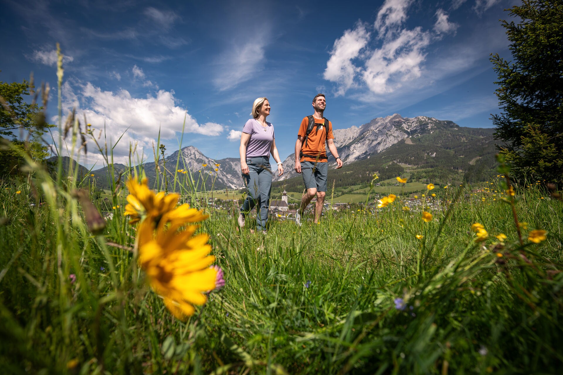 Der Weitwanderweg Gröbming ist eine malerische Rundwanderung, die im Zentrum von Gröbming beginnt und Wanderern atemberaubende Ausblicke auf die umliegenden Berge bietet. Die Strecke startet mit einem moderaten Anstieg über den Hofmanning und eröffnet nach kurzer Zeit einen beeindruckenden Blick auf Gröbming, den Stoderzinken und die Schladminger Tauern.