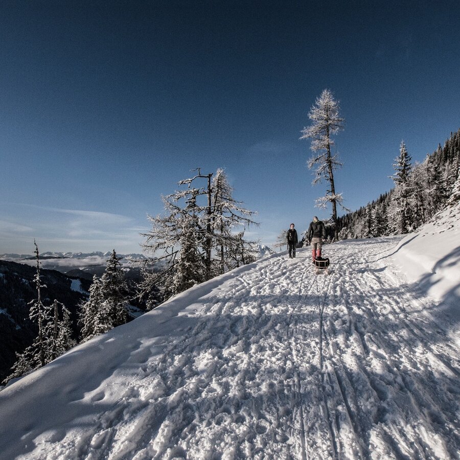 - Wer möchte, kann bei den Rodelverleihen eine Rodel ausleihen und diese mit hochziehen. Am Gipfel angekommen geht es über die 7 km lange Rodelbahn wieder rasant ins Tal.