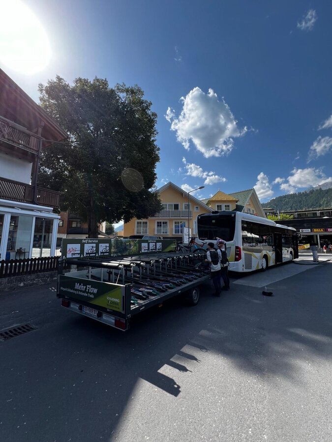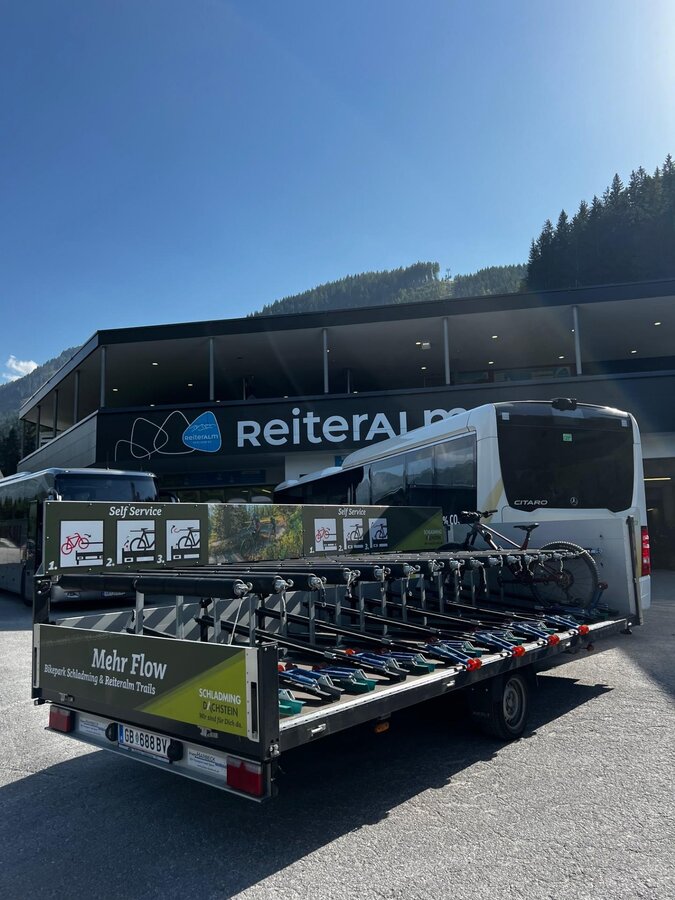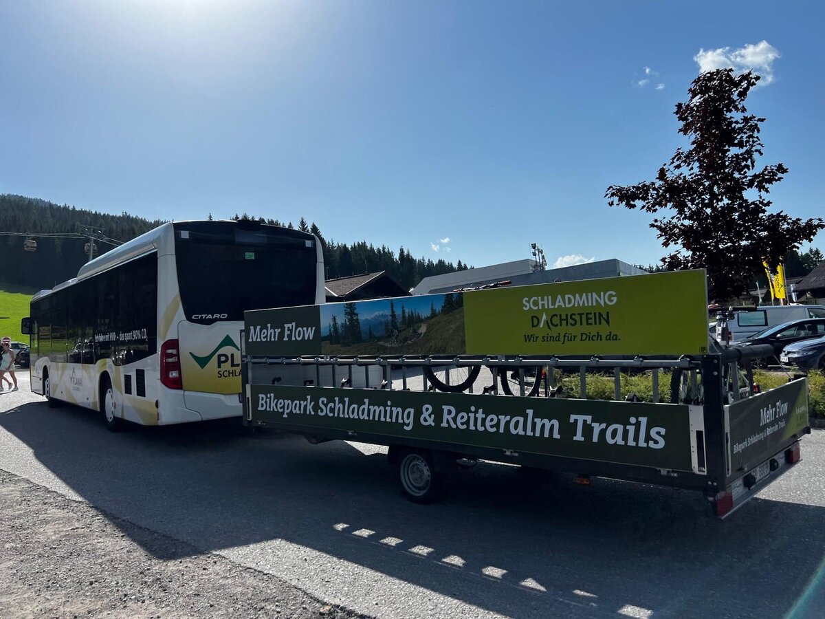 Der Bus ist mit einem Radanhänger unterwegs, damit auch Biker zwischen dem Bikevergnügen im Bikepark Schladming und den Reiteralm Trails ohne Auto wechseln können. Im Biketicket und in der Sommercard ist die Busfahrt inkludiert.