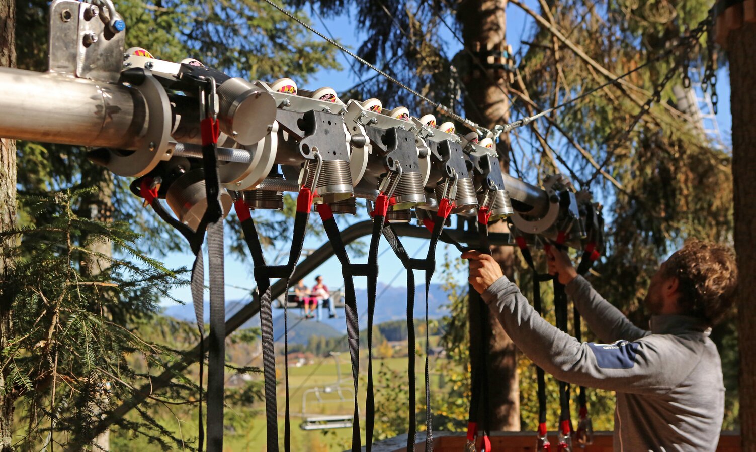 Eingehängt an einem Stahlrohr schweben Sie nahezu geräuschlos zwischen den Baumwipfeln meterhoher Fichten durch den Wald.