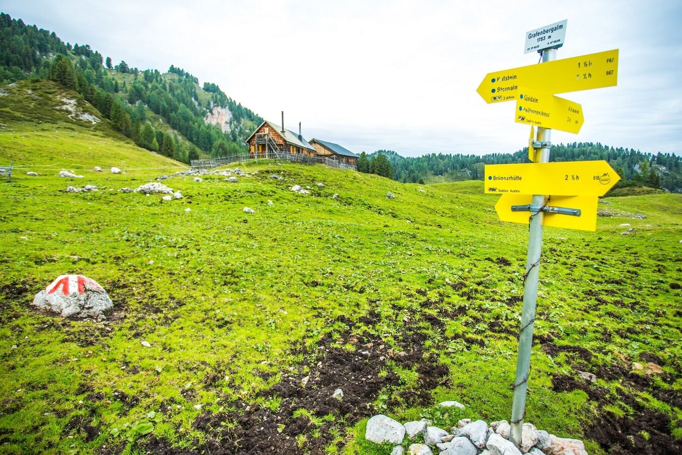 Vom Parkplatz bei der Wegkreuzung Sonnberg gehen wir auf dem Forstweg Richtung Kneippanlage. Zunächst geht es flach, den kleinen Gradenbach folgend, bis zur Jagdhütte (899 m) zum etwas versteckten Gradenbachwasserfall. Hinter der Hütte geht es auf dem Weg Nr. 668 über eine bewaldete Steilstufe hinauf. Teilweise ist der abschüssige Weg mit Drahtseilen gesichert. Nach dem Steilstück führt der Weg in ein romantisches Hochtal. Ein kleiner Bach muss mehrfach gequert werden. Nach ca. 2,5 Std. ist der Ahornsee erreicht. Am Ufer steht eine kleine Hütte, davor kann man sich wunderbar niederlassen und entspannen. Wer noch über Energie verfügt, kann weiter zurm Grafenbergsee aufsteigen (ca. 30 min.). Auch die Grafenbergalm (1.783 m) ist in insgesamt einer Stunde vom Ahornsee aus erreichbar. Der Absteig erfolgt wieder durch das romantische Hochtal bis zum Ausgangspunkt an der Kneippanlage in Weißenbach.