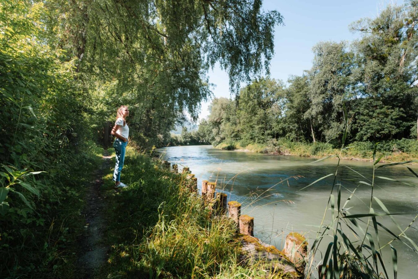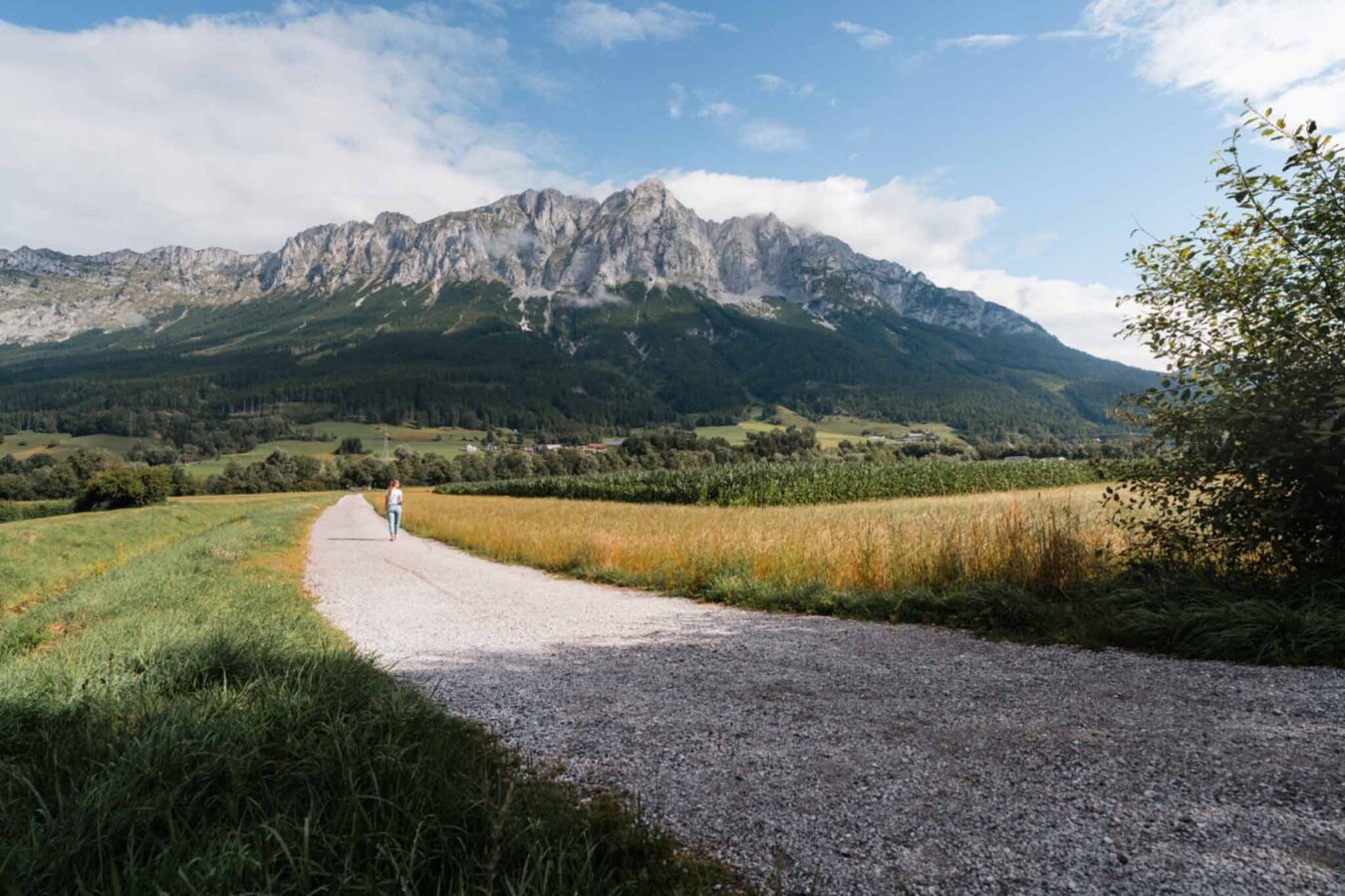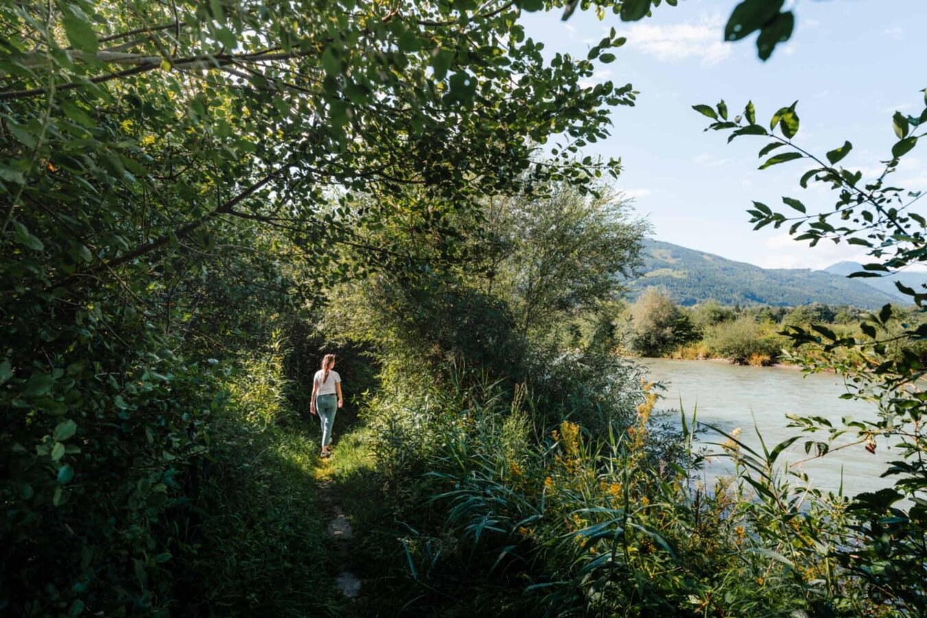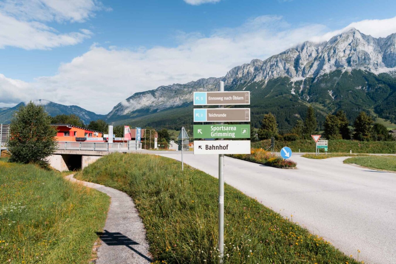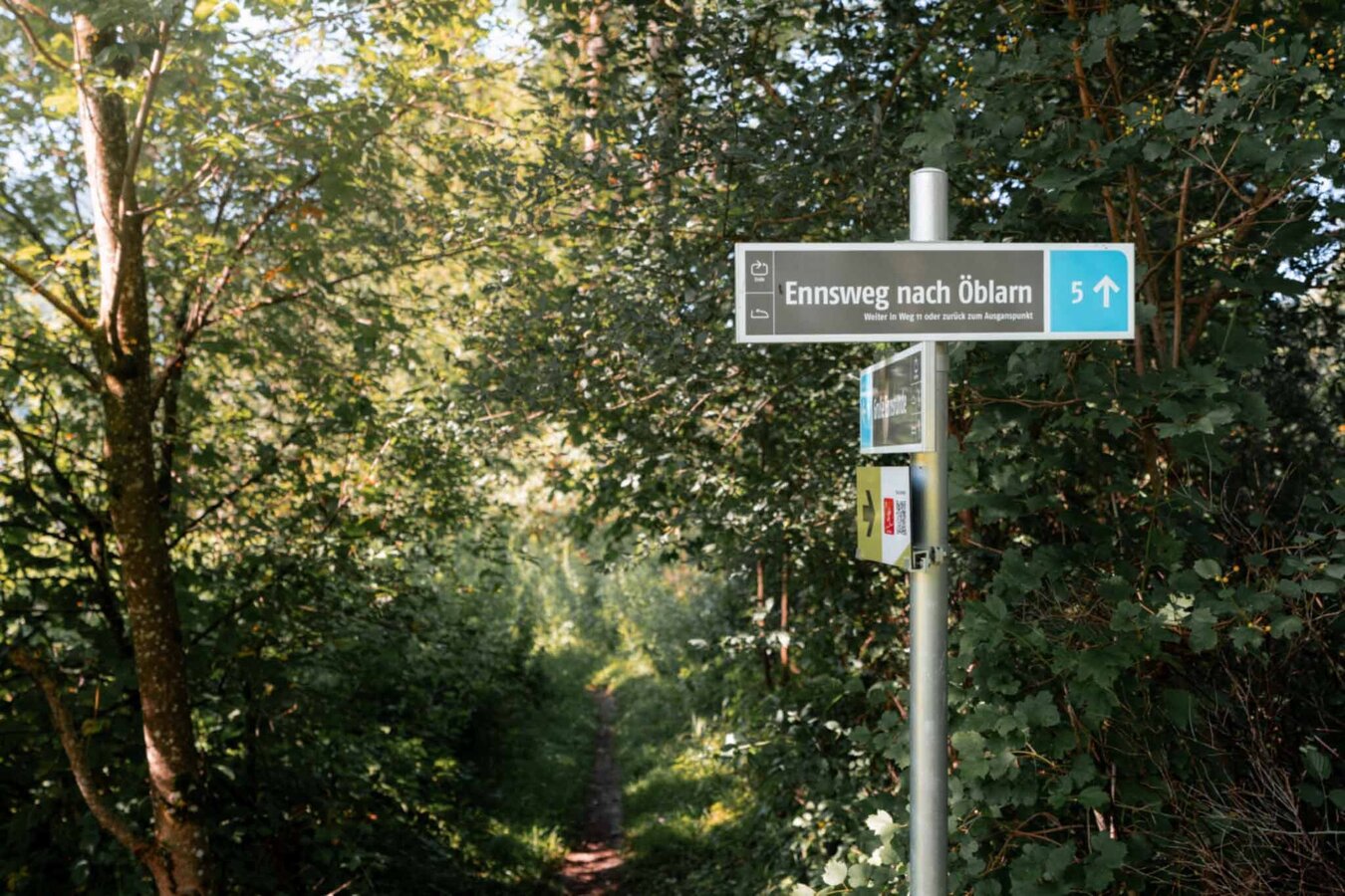 Sonnbergstraße bis Abzweigung nach links - Schotterweg, bergab zum Bauernhof vlg. Murberger und bergab zur Niederöblarner Straße - Richtung Öblarn, nach 100 m rechts abbiegen, überqueren des Bahngleises und der Landesstraße, weiter bis zur Enns, flussaufwärts entlang des Ennsuferweges.