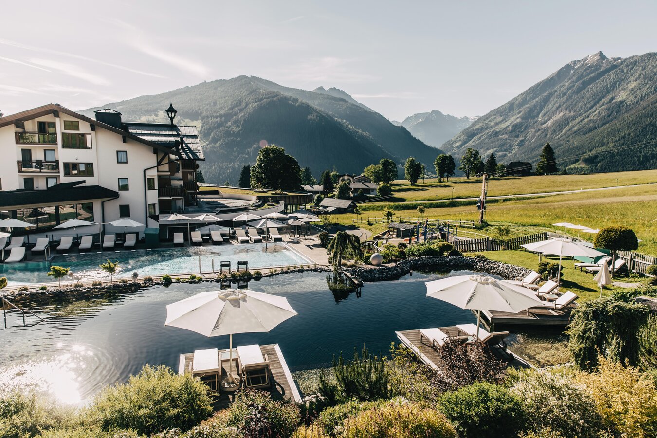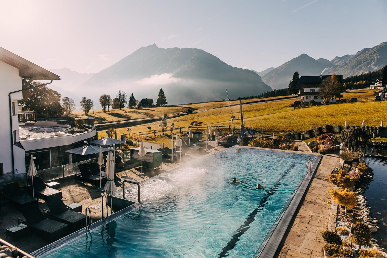 Die Terrasse lädt zum Verweilen ein und bietet einen herrlichen Blick auf die umliegende Bergkulisse, während die stilvolle Bar den Abend bei Cocktails abrundet.