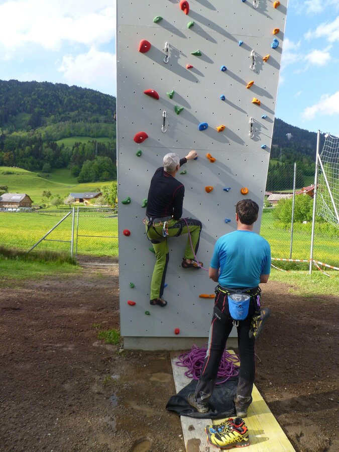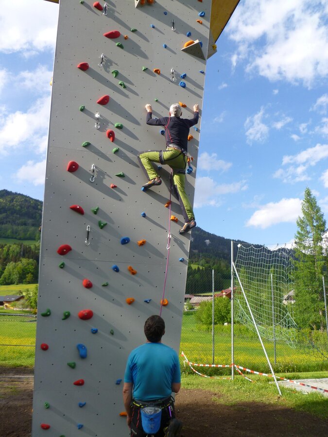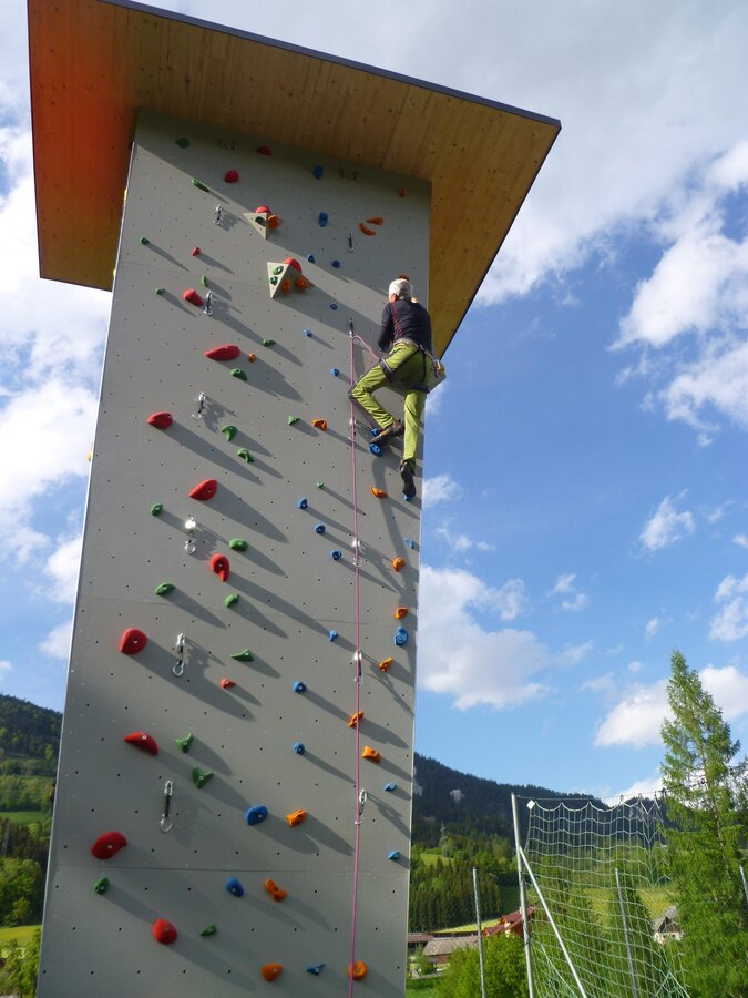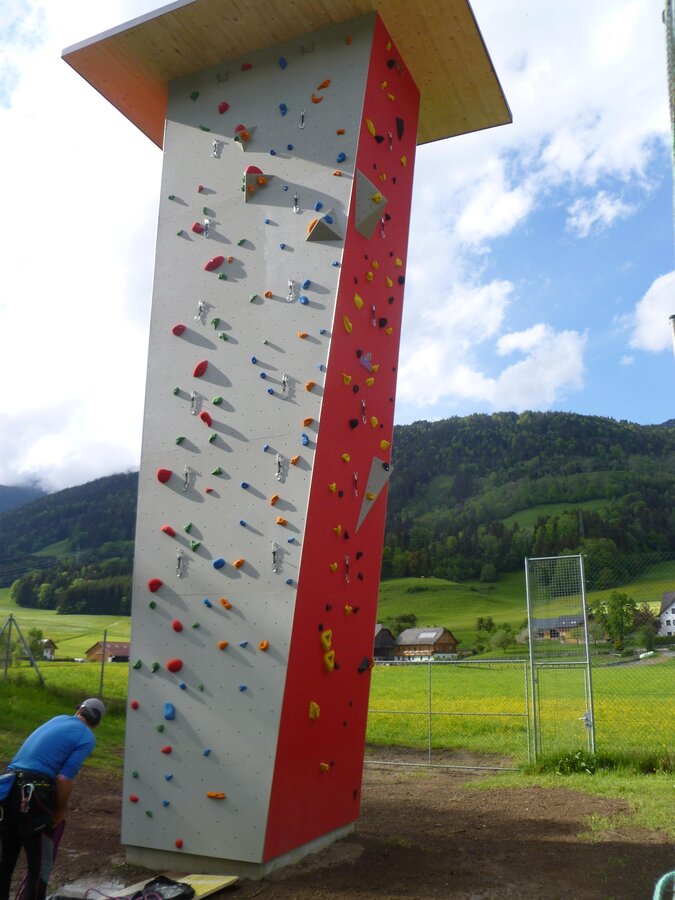 9 m hoher Kletterturm in Aich mit 12 Routen und Schwierigkeitsgraden von 4 bis 7.