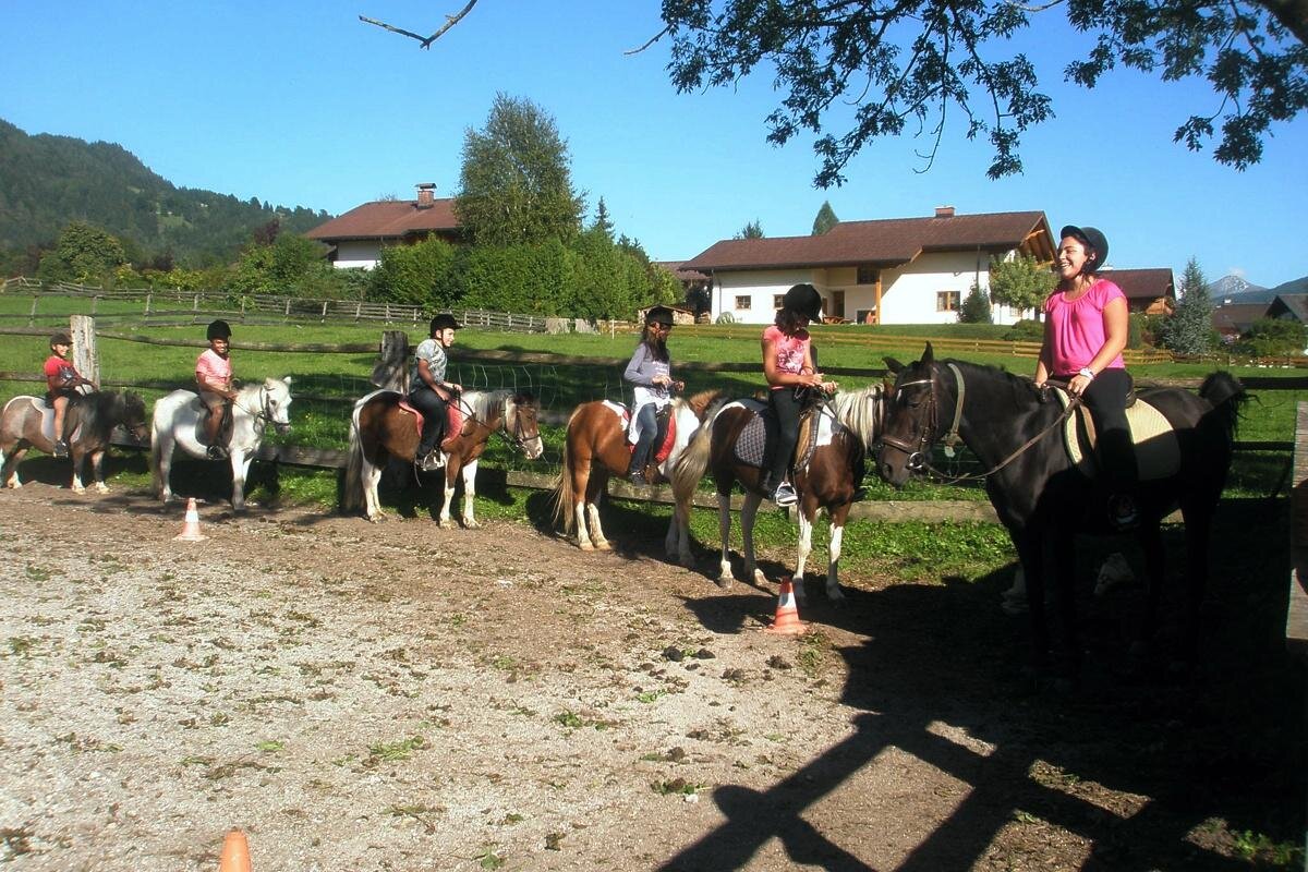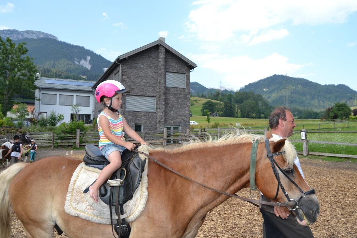 Auf unserem Reitplatz, gleich neben dem Hof lernen Kinder und auch Erwachsene die Grundbegriffe des Reitens. Wir haben verschiedenste Pferderassen, für jede Körpergröße ist etwas dabei und unsere Tiere sind den Umgang mit Kindern gewohnt. Auch ein Ausritt in die wunderschöne Landschaft rund um unseren Reiterhof ist ein Erlebnis.