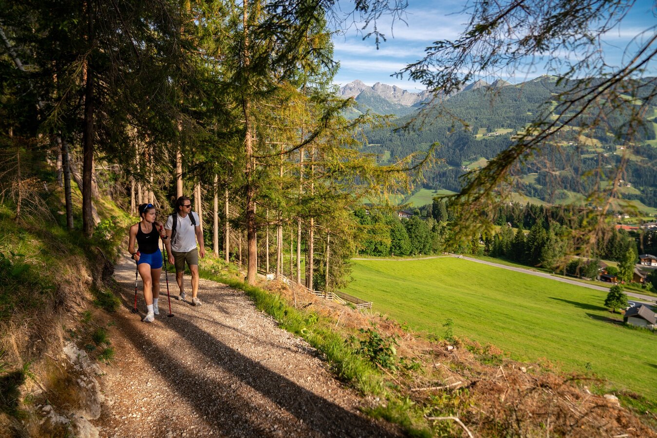 Ausgangspunkt Ramsau Kulm beim Infobüro Ramsau. Der Weg führt zunächst bis zum Wegkreuz Alpenbad. Links zum Hofrat Gruber Weg und dann immer am Ramsau Bach entlang bis zum Wegkreuz an der Brücke (rechts Aufstieg zum Hotel Edelweiß und Kindererlebnispfad). Geradeaus geht es zur alten Bauernmühle und dem Kinderklettersteig mit Fortsetzung zur Lodenwalke. Links, über die Wiese, geht es zum Wegkreuz Percht, wo man Richtung Jausenstation Fliegenpilz und Silberkarklamm wandern kann.
