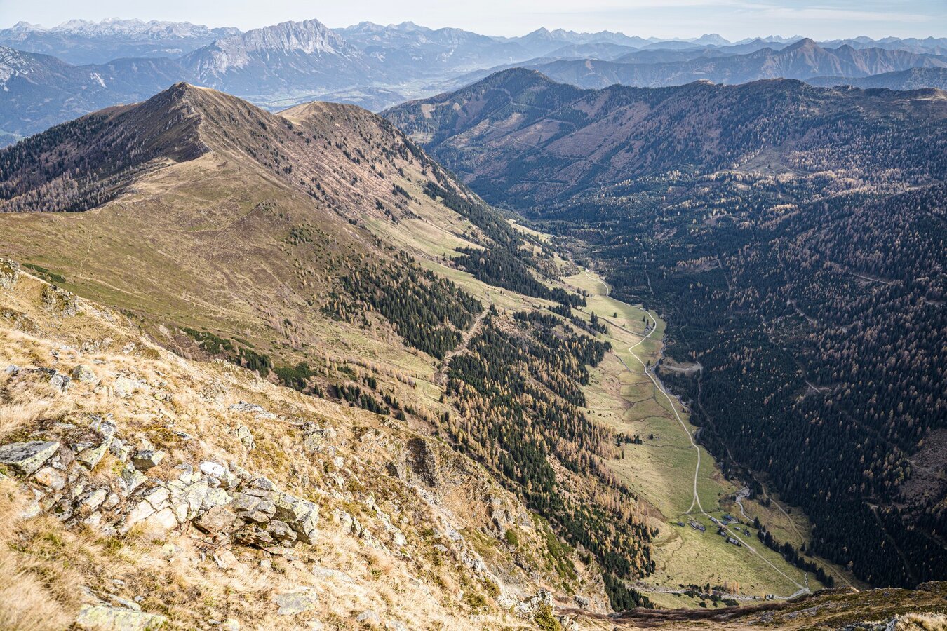 Vom Bottinghaus wandert man auf dem Fahrweg rechts hinauf und erreicht in ca. 10 Minuten ein Wegkreuz, wo der schöne Waldsteig beginnt. Es geht zunächst gemütlich durch den alten Hochwald mit auffallende knorrigen Fichten, Lärchen u. Zirben, quert einige Lichtungen und erreicht dann bald die Waldgrenze. Nun geht es etwas steiler durch die Kampfzone des Waldes, wo nur noch vereinzelt kleinwüchsige Lärchen zwischen den ausgedehnten Alpenrosenfeldern reizvolle Motive bieten. Nach einer knappen Stunde Gehzeit erreicht man die nicht bewirtschaftete Pleschnitzzinken Hütte u. kann zunächst einmal die prachtvolle Aussicht in das Ennstal, zum Stoderzinken u. Dachstein genießen. Über den sanft ansteigenden grasigen Rücken wandert man anschließend gemütlich hinauf zum Gipfelkreuz. Weiter in die selbe Richtung (bzw. zunehmend südwestlich) auf dem schmäler werdenden Kamm zum Gipfl des Scheiblecks (2117 m). Der Weg auf den Gamskarspitz (direkt nach Süden am Kamm bergan) überwindet noch einmal ca. 400 Höhenmeter, ist felsig und eher für Geübte. Die Aussicht vom Gipfel des Gamskarspitzes (bzw. Schobers) ist allerdings absolut lohnend! Zurück bis zum Pleschnitzzinken geht es auf dem selben Weg. Von dort an entlang der anderen Seite des Grates bergab, über die Galsterbergeralm, die auch als Einkehrmöglichkeit dient.