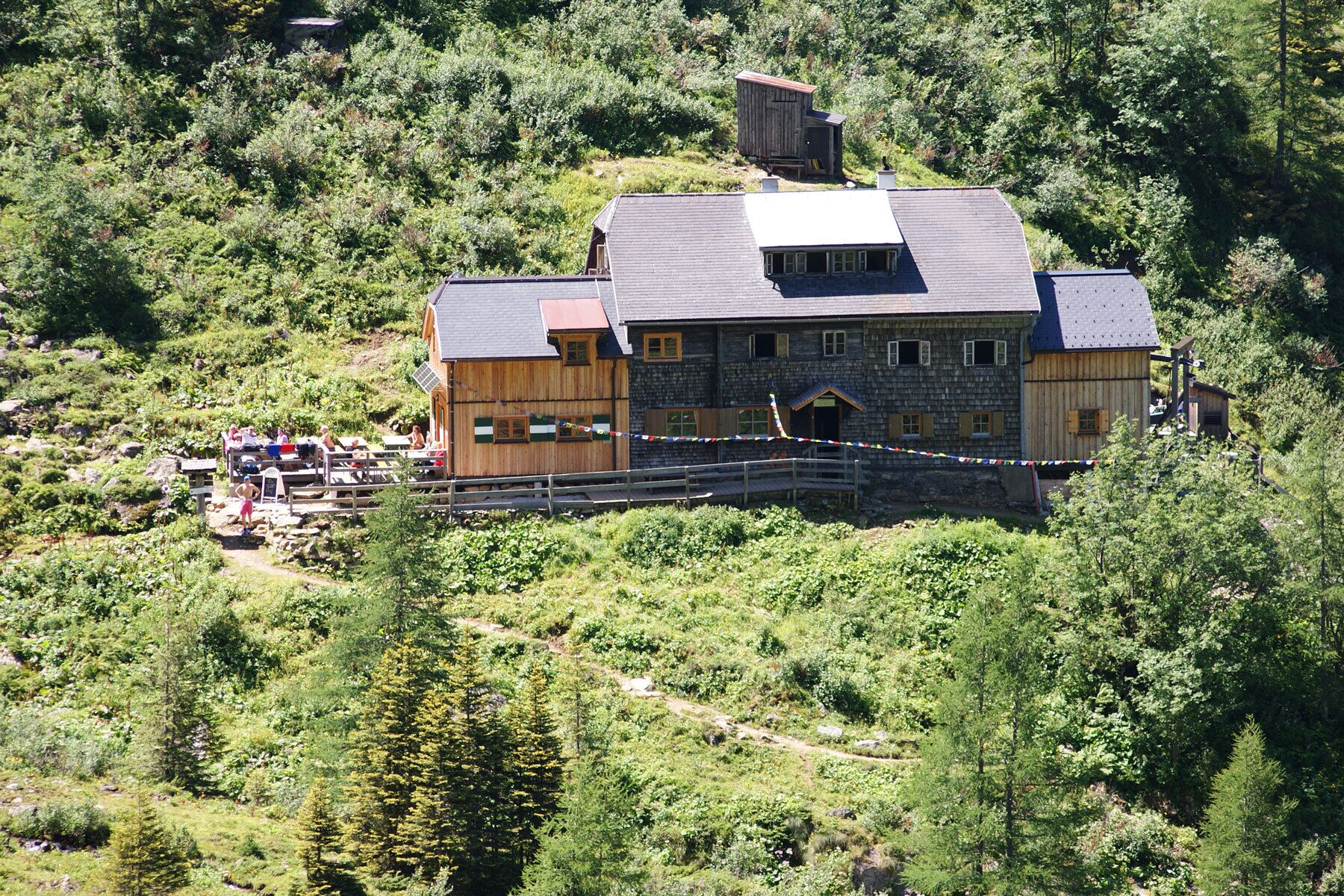 Der Weiterweg führt über einige Geländeschwellen steil hinunter in die Lämmerkare und über einen Wiesenhang bis zur Preintalerhütte und Waldhornalm auf 1.656 Meter.