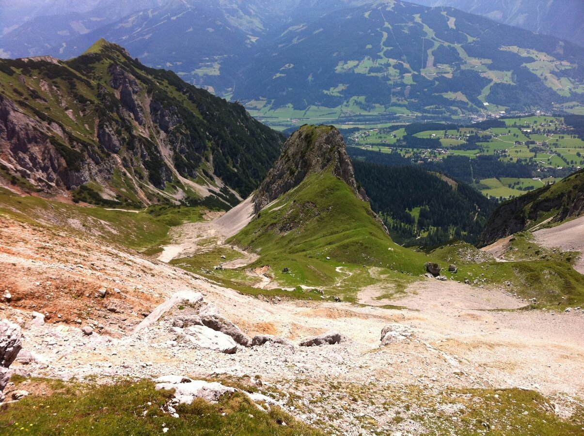 Auf dem Weg Nr. 618, hinter Sinabell und Wasenspitze vorbei bis zur Abzweigung zum Weg 619. Reizvoll ist der Tiefblick auf den kleinen, in einem Felskessel ruhenden Hölltalsee (Silberkarsee) und die großartige Natur mit weitläufiger Aussicht über die Landschaft „Am Stein“. Ein verkarstetes Hochplateau, das sich über 20 km² im Norden und Osten des Dachstein erstreckt, wo kleine Felsgipfel, grüne Hügel, Zirbenwälder und tief eingeschnittene Kare eine wundersame Landschaft bilden. Es folgt der Abstieg über die Stangalm, steil und steinig in Serpentinen hinunter zur Silberkarhütte, vorbei am Klettersteig Siega. Die Hütte auf 1.223 m bietet den Wanderern und Klettersteiggehern reichhaltige Bioprodukte vom eigenen Bio-Bauernhof. Das restliche Wegstück ist noch einmal anders und kurzweilig. Es geht durch die romantische Wildwasserklamm am Schleierwasserfall vorbei, über Stiegen und Stege immer am rauschenden Bach bergab. Mit dem Hias Klettersteig und dem Rosina Klettersteig befinden sich 2 weitere anspruchsvolle Klettersteige gleich in Talnähe.