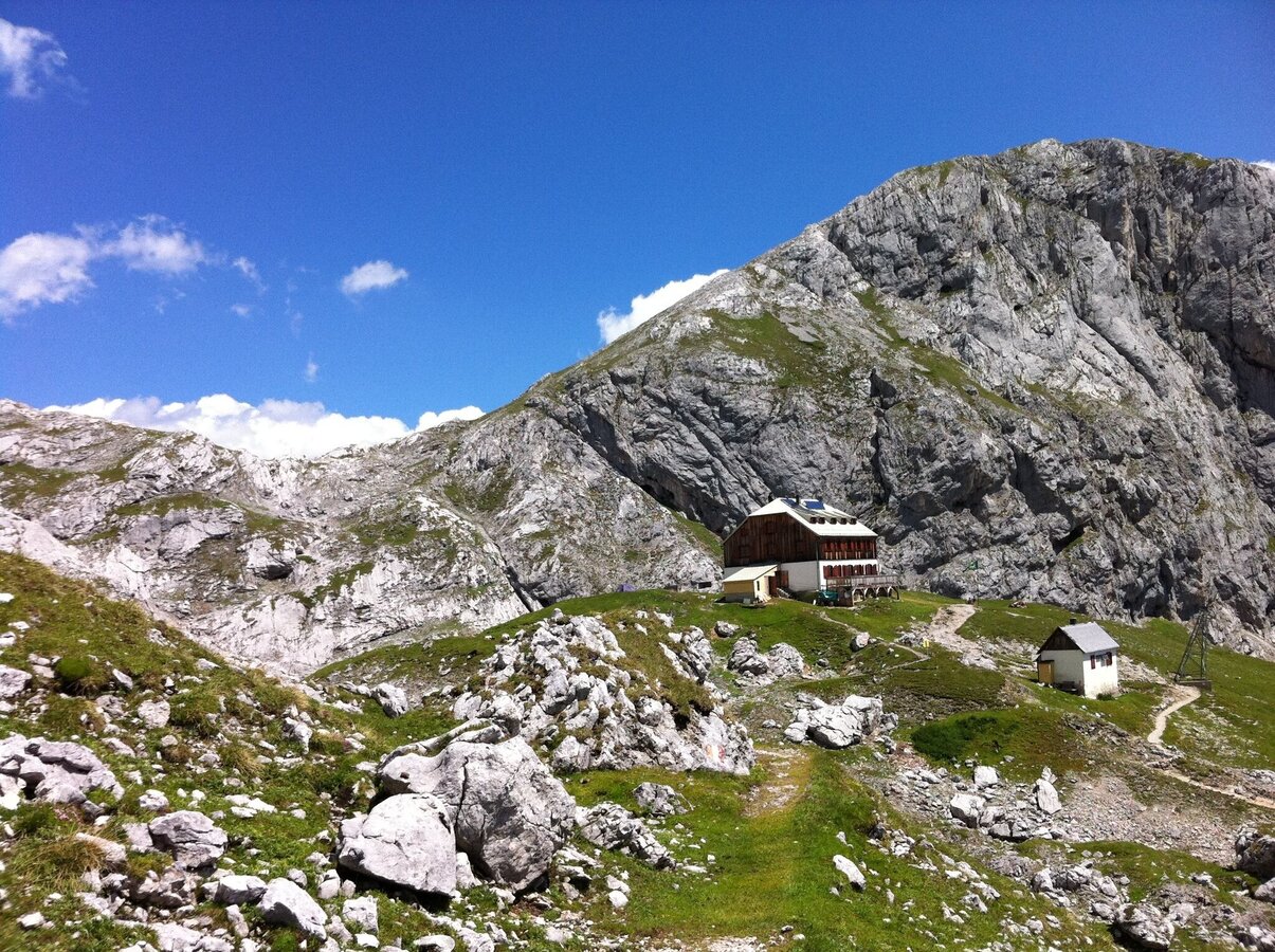 Die Hütte wurde im Jahr 1914 erbaut und liegt eingebettet zwischen dem felsigen Gipfelzug der Scheichenspitze und dem Sinabell, auf einem vorgelagerten grünen Hügel. Wunderschöner Aussichts- und wichtiger Wanderknotenpunkt! Da wäre zum Einen der Weg zum Dachstein Gletscher, die Überquerung des verkarsteten Hochplateaus Richtung Norden zum Krippenstein oder der Aufstieg zur Scheichenspitze und der Ramsauer Klettersteig. Ab hier bewegt man sich in hochalpinem Gelände – entsprechendes Verhalten ist Voraussetzung für sicheres Wandern. Der Hausberg des Guttenberghauses ist der Sinabell. Der Gipfelanstieg dauert eine gute Stunde und wird auch als Abstiegsvariante vom Austria Klettersteig Sinabell genutzt.