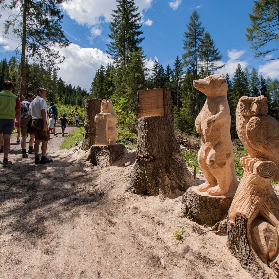 Im oberen Bereich des Weges - zwischen der Station Hexenhäusl und der Talstation der Gipfelbahn Hochwurzen verläuft der Weg teilweise entlang der Rohrmooser Landesstraße. Bitte hier besonders auf Kinder achten! In diesem Abschnitt befinden sich außerdem keine Spielstationen.