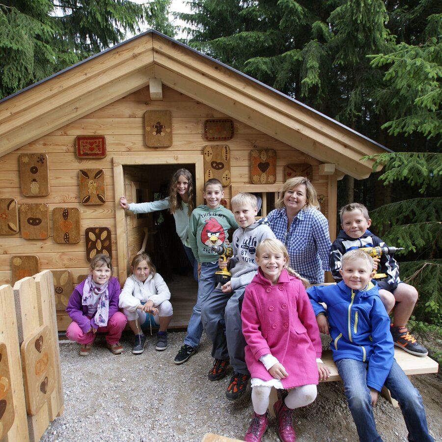 Vorbei am Apart & Suiten Hotel Weiden und Hotel Schwaigerhof wanderst über einen schönen Wiesenweg Richtung Westen. Das prachtvolle Dachstein-Massiv vor Dir, führt der Weg entlang liebevoll gestalteter Märchenfiguren und Spielgeräte kinderwagentauglich zum „Hexenhäusl“. Auf dem Weg warten unter anderem Rapunzel, Fred Feuerstein, die Bremer Stadtmusikanten, Frau Holle und der Froschkönig auf die kleinen Gäste.