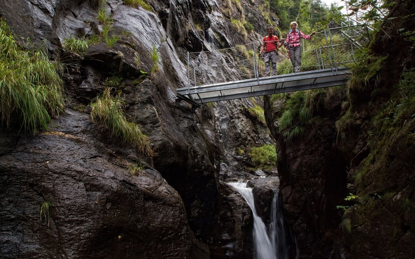 Nach der Fahrt bis ans Ende des Untertals in Rohrmoos (am besten mit dem Wanderbus der Planai-Hochwurzen-Bahnen) beginnst Du die Wanderung beim Almgasthaus Riesachfall. Gleich zu Beginn des Alpinsteiges wirst Du vom rauschenden Wasser „begrüßt“. Der Weg durch die „Höll“ windet sich entlang des tosenden Riesachwasserfalls und verlangt von uns bei den zahlreichen steilen Stufen und Steinen Trittsicherheit. Schwindelfreiheit ist vor allem beim Passieren der imposanten Hängebrücke gefragt.