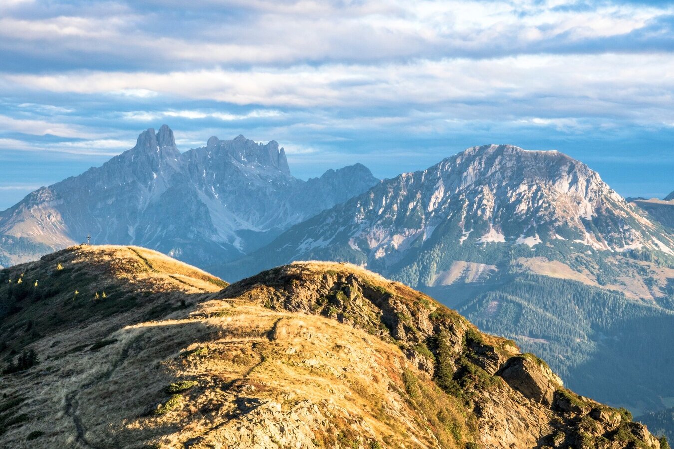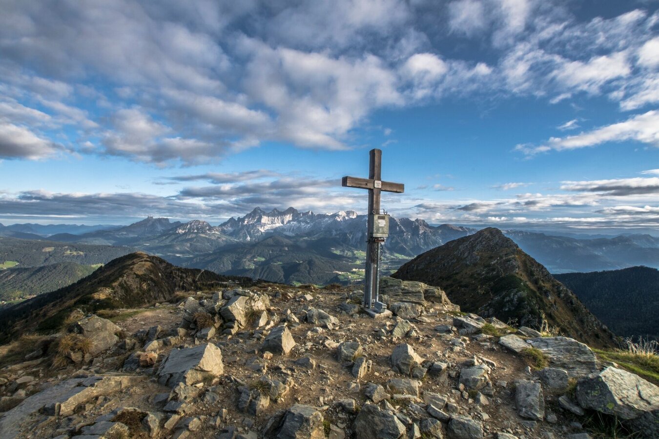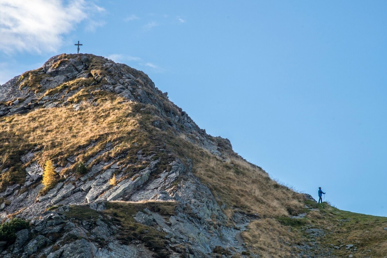 Nach diesem ersten Aufstieg folgt eine etwas "gemütlichere" Passage: mit leichtem bergauf und bergab - und nur wenig steileren Stellen - geht es entlang des Höhenrückens in Richtung Rippetegg. Über einen etwas schotterigen Anstieg (ca. 15 Minuten) gelangen wir zum Gipfel des Rippetegg auf 2.126 Meter Seehöhe.