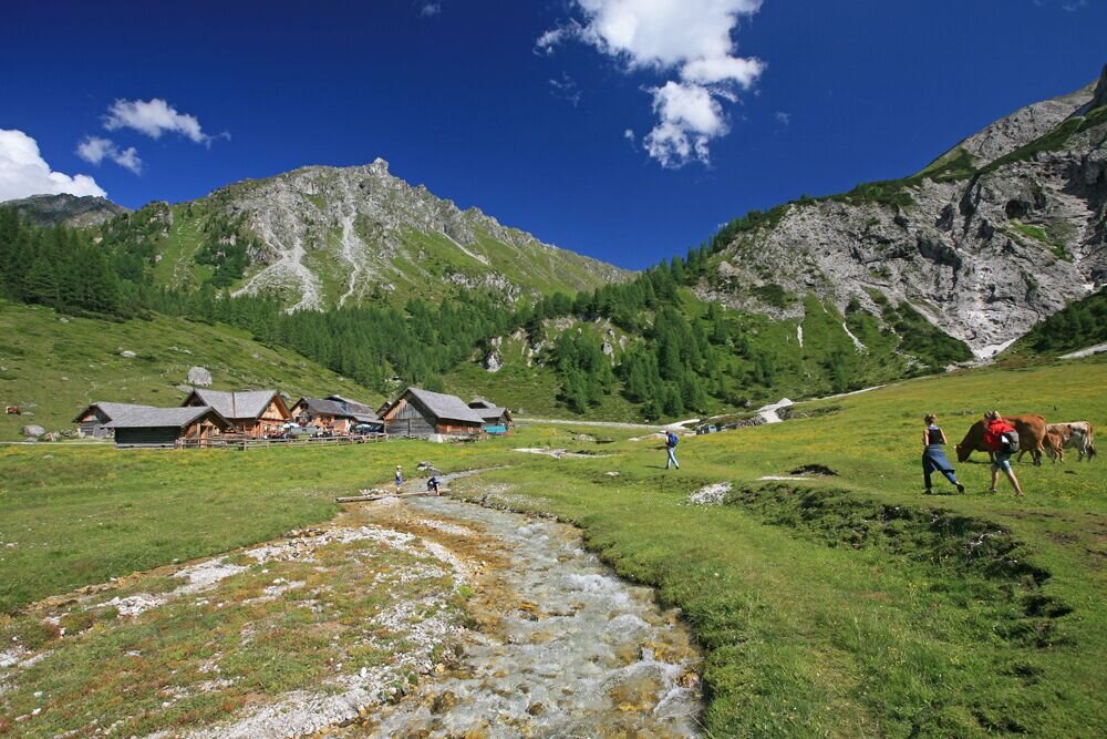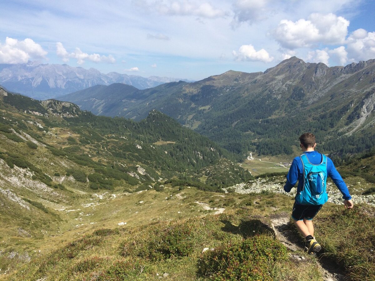 Ab der Akarscharte folgst Du dem Weg Nr. 702 bergab bis zur Oberhütte. Du wanderst dabei im Bereich nach der Akarscharte durch eine interessante Landschaft: Dolinen, runde Buckel reihen sich aneinander und das helle Gestein mitten im Urgestein der umliegenden Berge weist auf ein Kalkfenster im Urgestein hin. Es sind knapp 500 Höhenmeter im Abstieg.