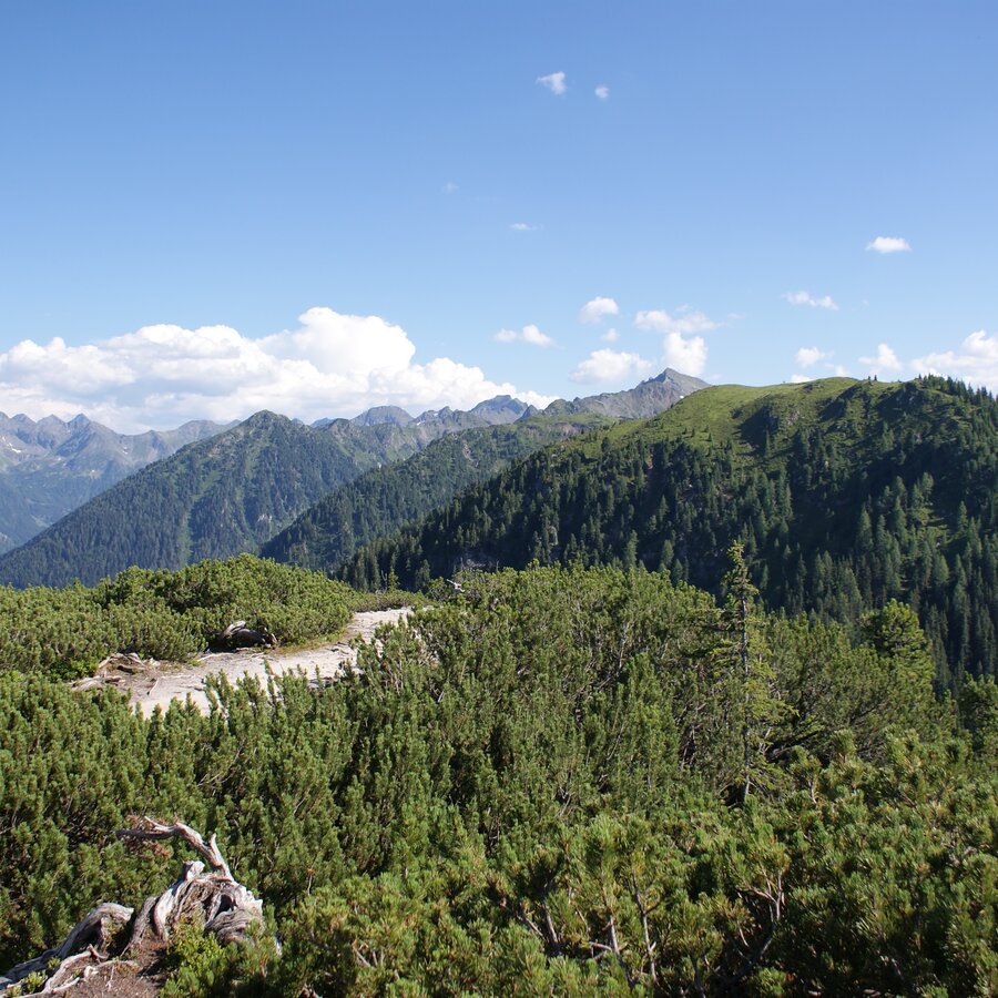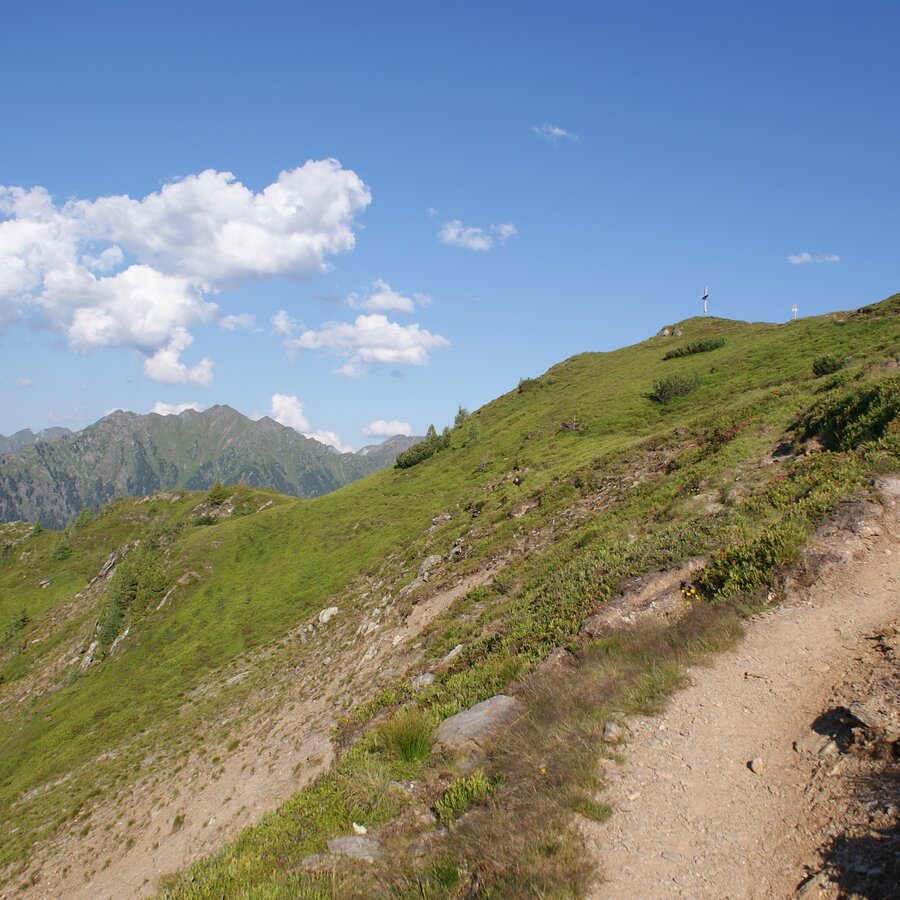 Den weiteren Wegverlauf bildet der aus dem Obertal kommende Weg Nr. 773, der nun aus dem Sattel durch einen mit vielen Zirben durchsetzten Kampfzonenwald auf den beliebten Aussichtsgipfel der Guschen (1.983 m) hinaufführt. Vom Gipfelkreuz der Guschen führt der Weg zunächst über den Schneidergipfel und über die Westflanken des Hochfeldes und der markanten Erhebung des Schiedecks (2.339 m).