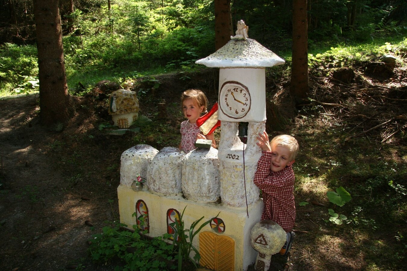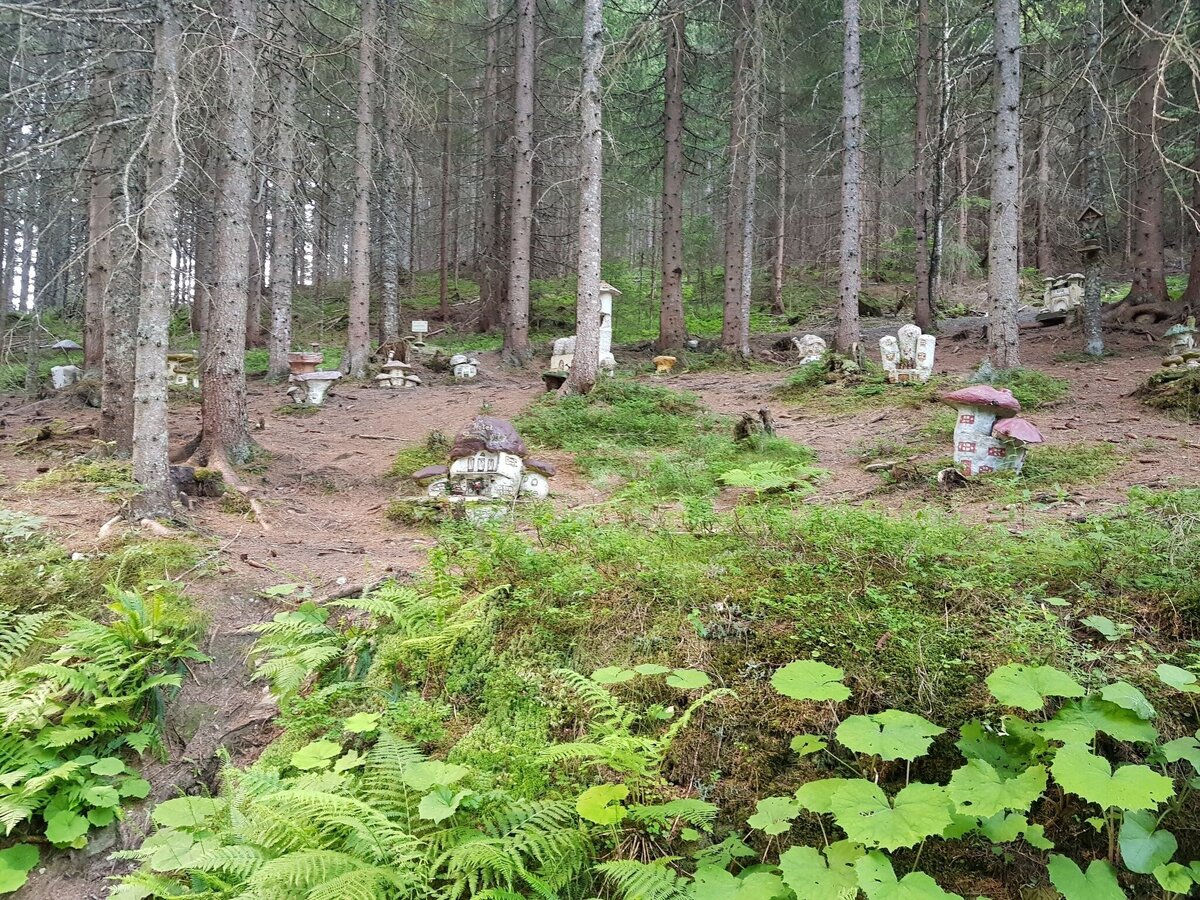 Vom Wanderportal wanderst du links vorbei am Sport-Shop Schi Lenz in Richtung Forstweg. Diesem folgst du für ca. 250 m und zweigst dann links auf den Schwammerlweg ab. Ein schöner, breiter Weg führt dich über die Skipiste und durch eine schöne Waldpassage bis zur Schwammerlstadt, die bei Kindern besonders beliebt ist.