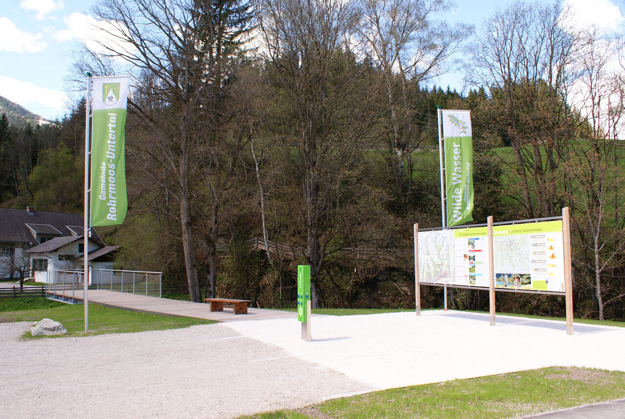 Der Themenweg Wilde Wasser startet mit dem Abschnitt durch die Talbachklamm in Schladming. Die beste Wahl fürs Parken ist die Parkgarage bei der Planai-Seilbahn im Planai-Stadion. Von dort folgt man der Wanderwegbeschilderung zur Talbachklamm (vorbei an der weißen, Evangelischen Kirche).