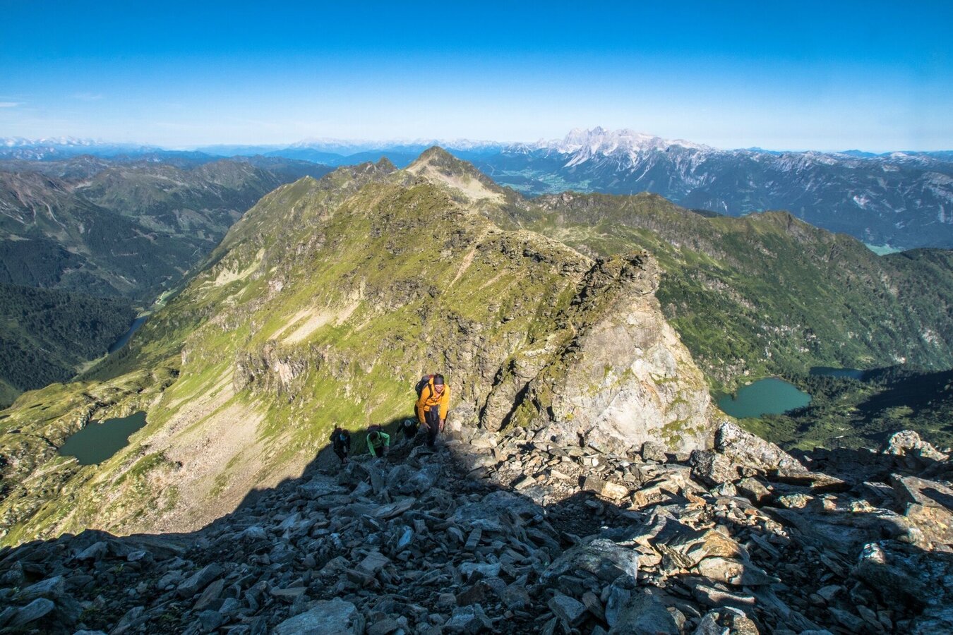 Hier beginnt der hochalpine Teil der Tour. Entlang der Flanken und über die Kleine Wildstelle (2.577 m) geht es mit einigen Kletterpassagen auf den Gipfel der Hochwildstelle (2.747 m), dem höchsten innersteirischen Berg. Die Aussicht ist grandios!
