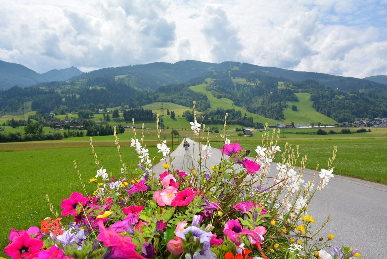 Leichte Wanderung vom Ort Haus über das Sonnenplateau Birnberg - mit wunderbarem Blick ins Ennstal - und die Ortschaft Weißenbach, die für ihren besonders schönen Blumenschmuck bekannt ist.