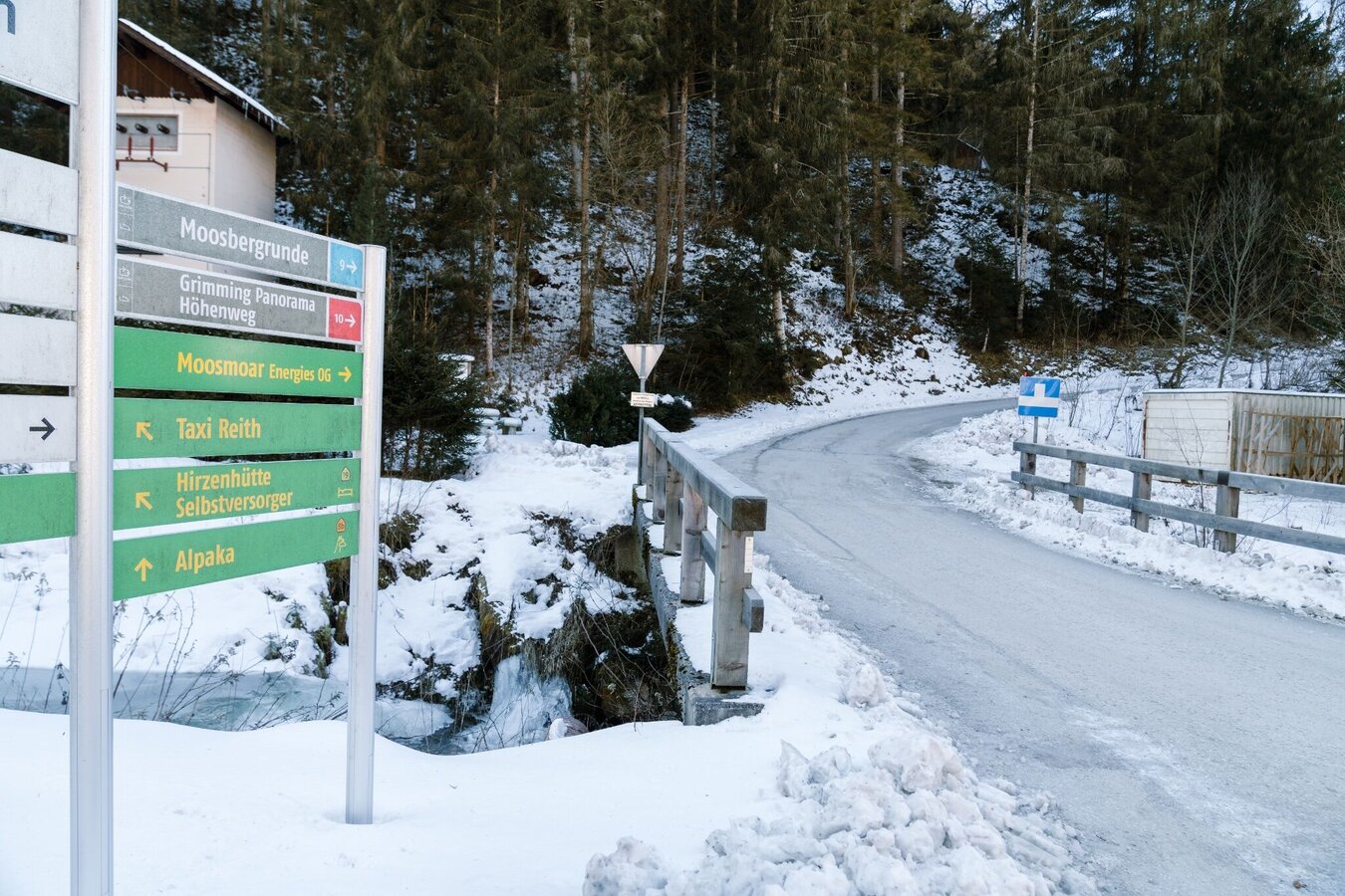 Vom Gasthof Grimmingtor die Straße taleinwärts bis zur Abzweigung Moosberg bei der Moosbergbrücke. Entlang des Güterweges Moosberg spazierst Du über einige Serpentinen bis zur Abzweigung Grimminger Panorama Höhenweg (GPHW) beim vlg. Moosmoar. Hier biegst Du rechts abund wanderst an einem alleinstehenden Haus oberhalb vom Schulgraben zur Zufahrt vom Hof vlg. Webersberger. Hier folgst Du der Moosbergstraße aufwärts zum Gehöft vlg. Gatschberger und danach stetig leicht bergab in Richtung Sonnberg. Nach einem Stück durch den Wald zweigst Du rechts auf den Privatweg zum vlg. Murberger ab. Weiter bergab geht es am Hof vorbei und dann über die Zufahrtsstraße vom Murberger hinunter bis zur Alten Landesstraße Niederöblarn. Vorbei am Hof vlg. Ripplmaier spazierst Du zurück in den Ort zum Parkplatz beim Gasthof Grimmingtor.