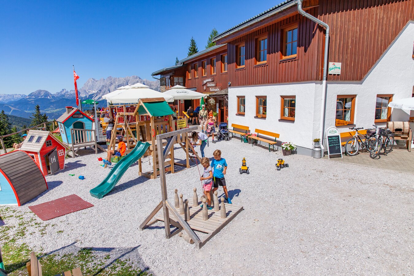 Auf der sonnigen Terrasse der d’Genussalm öffnet sich der Blick weit über die Bergwelt – mit dem imposanten Dachstein als eindrucksvolle Kulisse. Während sich die Kinder auf dem großzügigen Spielplatz austoben, genießen Erwachsene kulinarische Schmankerl aus regionalen Produkten. Die Küche überzeugt mit herzhaften Hüttengerichten, frischen Zutaten aus der Region und süßen Highlights wie flaumigem Kaiserschmarrn oder duftendem Apfelstrudel.