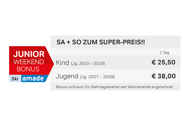 Mit dem Junior Weekend Bonus fahren Kinder und Jugendliche in Ski amadé jedes Wochenende (Samstag & Sonntag) zu besonders günstigen Konditionen. Dabei gibt es einen Preisvorteil von bis zu 35 % auf den Skipass.