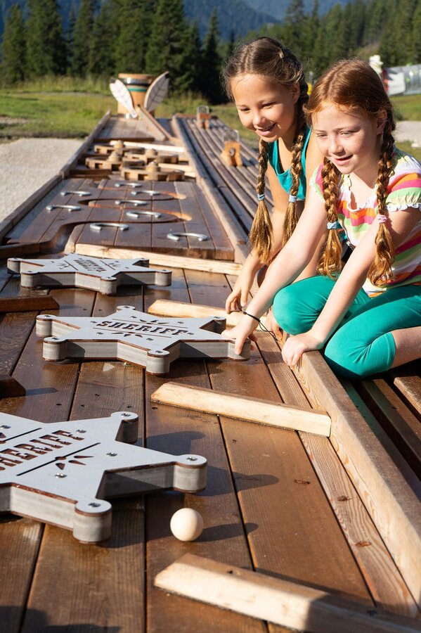 A tepee is available here for climbing, playing and sliding, and it even has an integrated marble run. From there, you can keep an eye on what's going on in the gold panning area. Bags of gold or precious stones can be bought in the saloon and then washed out.