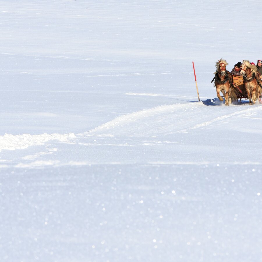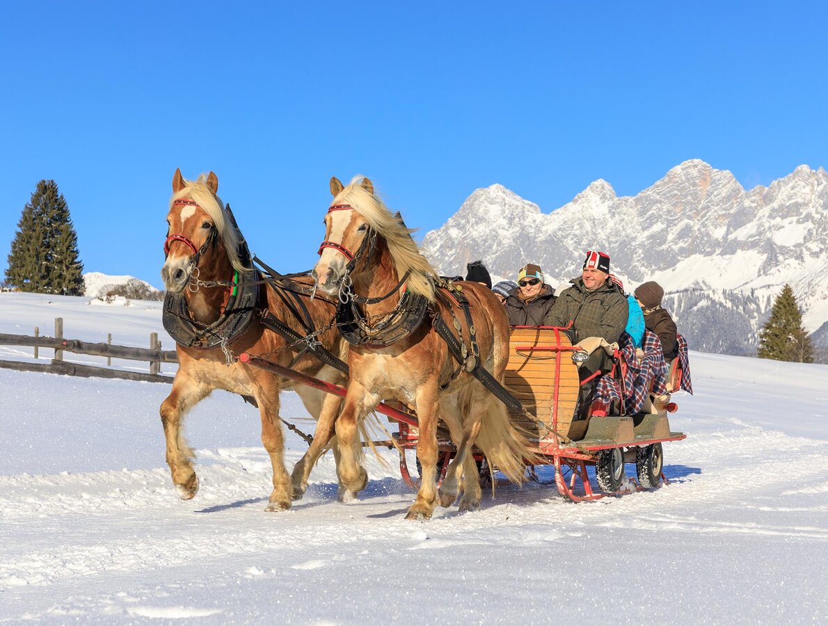 From the sleigh ride meeting point at Rohrmoos village the tour first heads along Rohrmoosstrasse and Tälerstrasse roads to the "Ahornweg" turn-off at Obertal-West. Passing by several nice farm houses the tour makes a small loop into Obertal, where you will enjoy the fresh winter air. Before getting back to the starting point in the village of Rohrmoos the tour also takes you across the sunny meadows of Rohrmooser Frei. Remark: of course the route always depends on the weather conditions and firmness of underground!