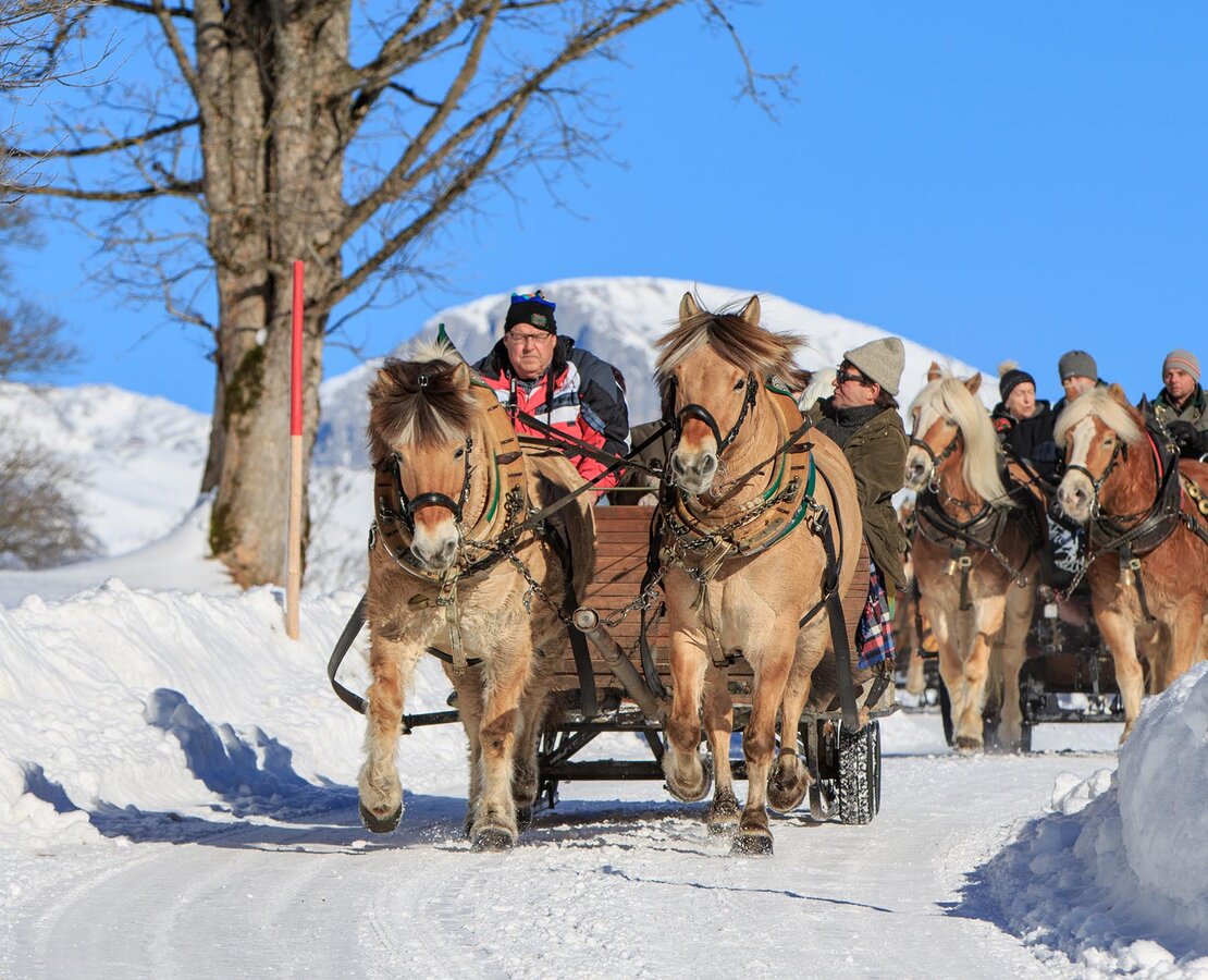 There is a minimum fee per sleigh. Additionally the prices depend on the length of the tour agreed upon with the respective provider. Kids up to 10 years get a 50 % reduction. If the ride ends after 7 pm there is a night shift premium! Rustic alpine chalets along the way invite you to enjoy a refreshment stop – out on their sun terraces or next to a warm, cozy tiled stove, sipping on a mug of hot chocolate or spiced wine.