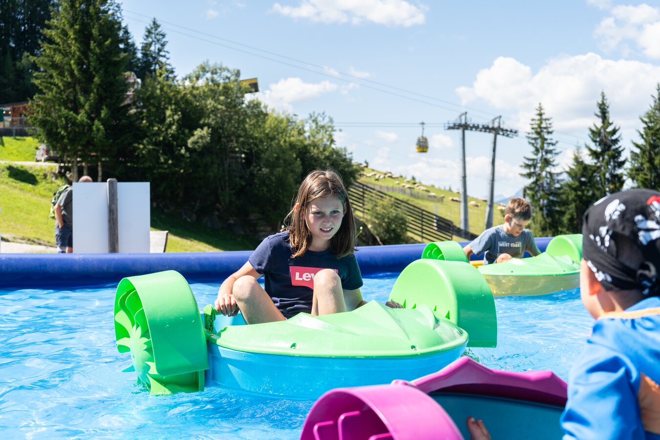 At the mountain station of the 8-seater gondola lift, there is a large playground with a giant sandpit, the SCHAFwerkstatt with arts and crafts fun and a lovely petting zoo with ponies, donkeys, goats, mini pigs and more. Water zorbing and paddle boats provide variety. The 8-seater Kaiblinggrat chairlift takes you to the Senderplateau (1,870 m), the perfect starting point for all hikes.