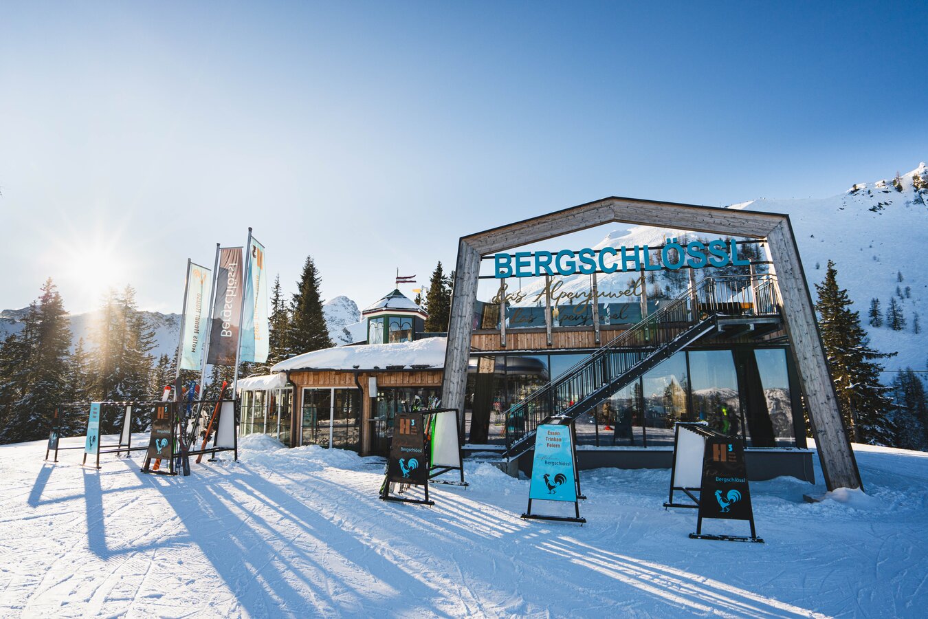 The TOMiziel also invites you to start in style: With a view of the Dachstein and lovingly prepared delicacies, the morning begins with an alpine flair. And in the elegant Bergschlössl, the first morning sun pampers you on the panoramic terrace - probably the most beautiful place for an enjoyable start to the day's skiing.