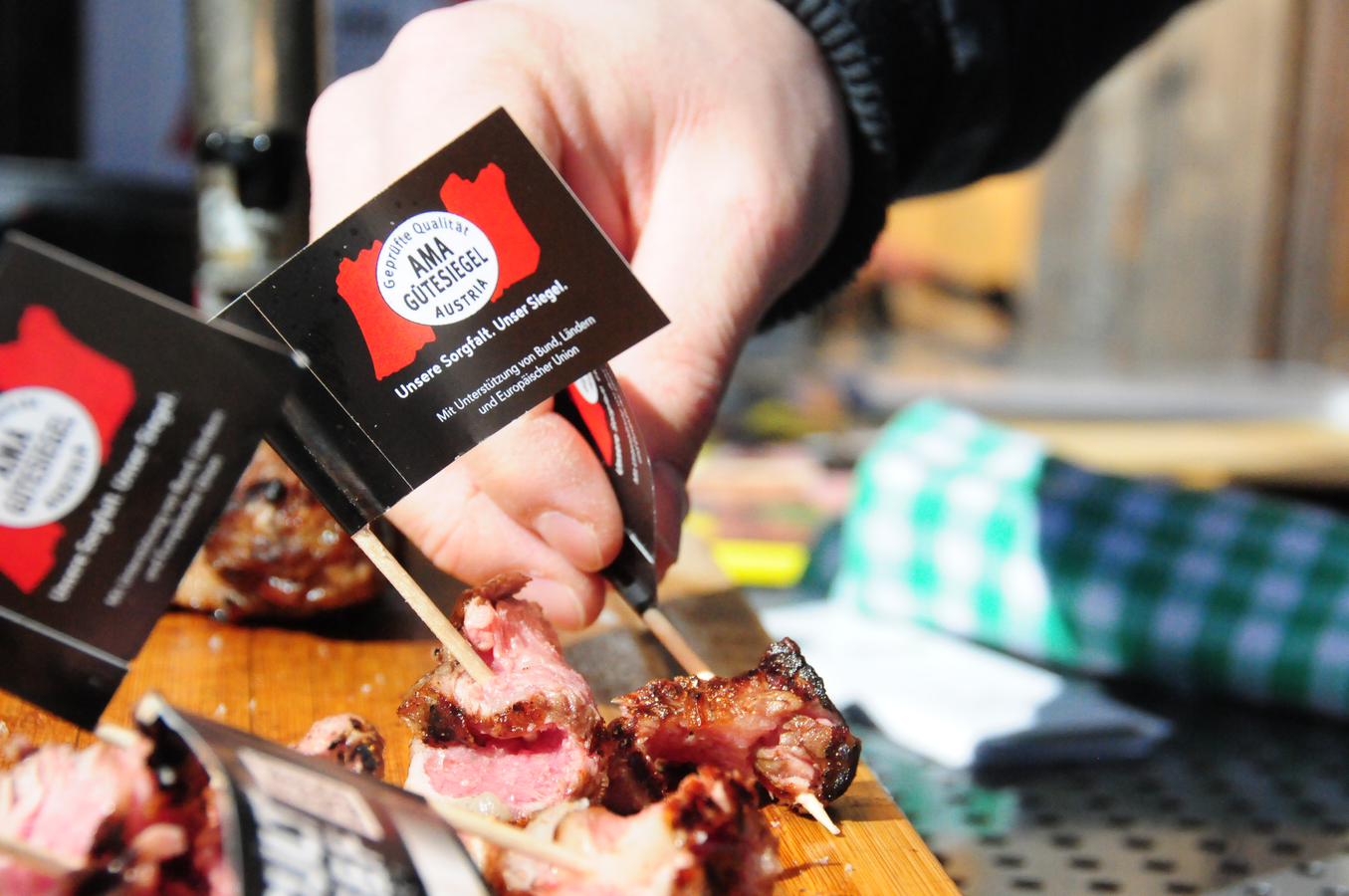A piece of juicy beef is served at the "Snow & Beef" event tasting. A hand sticks small flags with the AMA seal of approval into the pieces of meat - a symbol of regional quality and barbecue enjoyment at the highest level. | © Hauser Kaibling