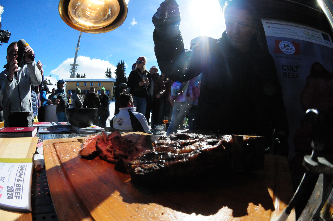 A grill master prepares a juicy steak on a snow table while guests watch the live barbecue at the "Snow & Beef" event. The meat sizzles in the sun that shines over the snow-covered Hauser Kaibling. | © Hauser Kaibling