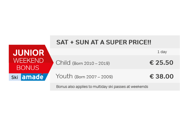 With the Junior Weekend Bonus, children and teenagers ski in Ski amadé every weekend (Saturday & Sunday) at particularly favorable conditions. There is a price advantage of up to 35% on the ski pass.
